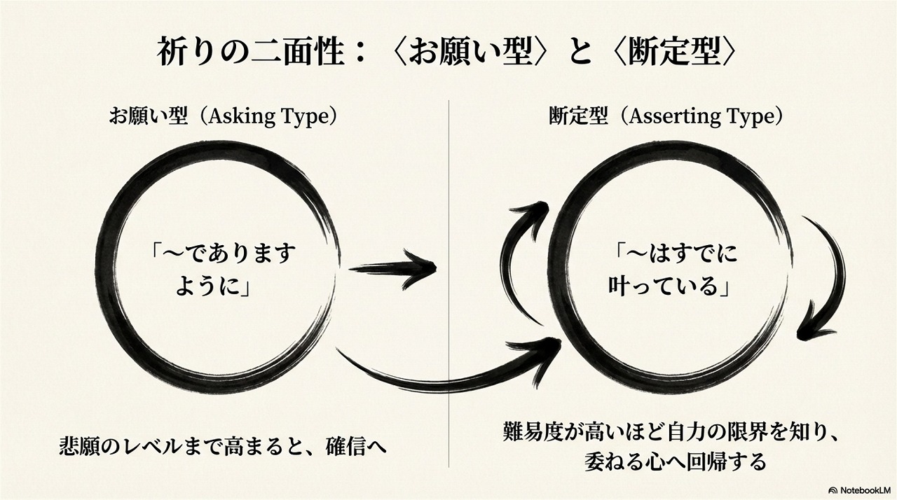 これは前回の復習ですが、祈りには〈お願い型〉と〈断定型〉の2つあると言いました。