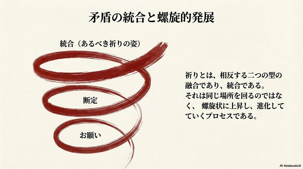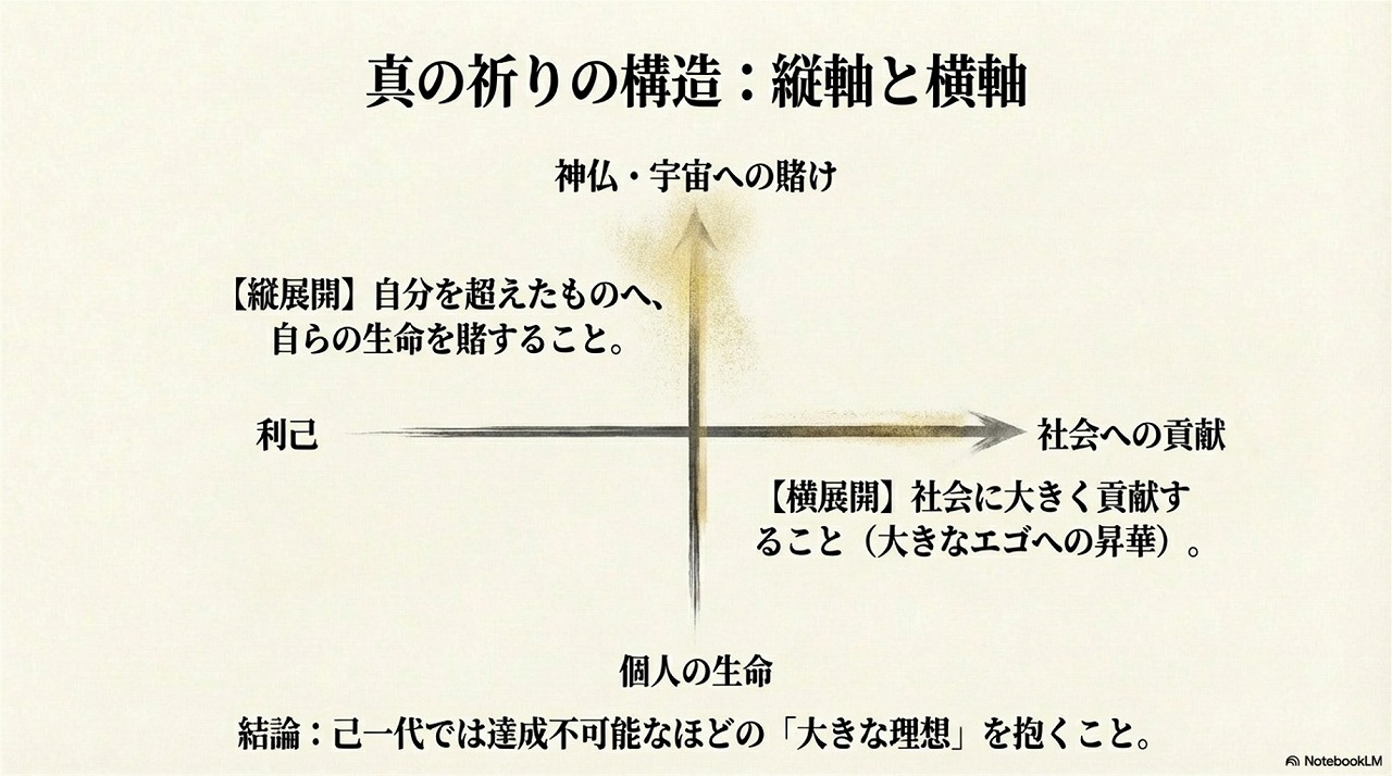 - 祈りとは願望成就の手段ではなく、自分を超えた崇高な理想と結びつく「生き方そのもの」である。