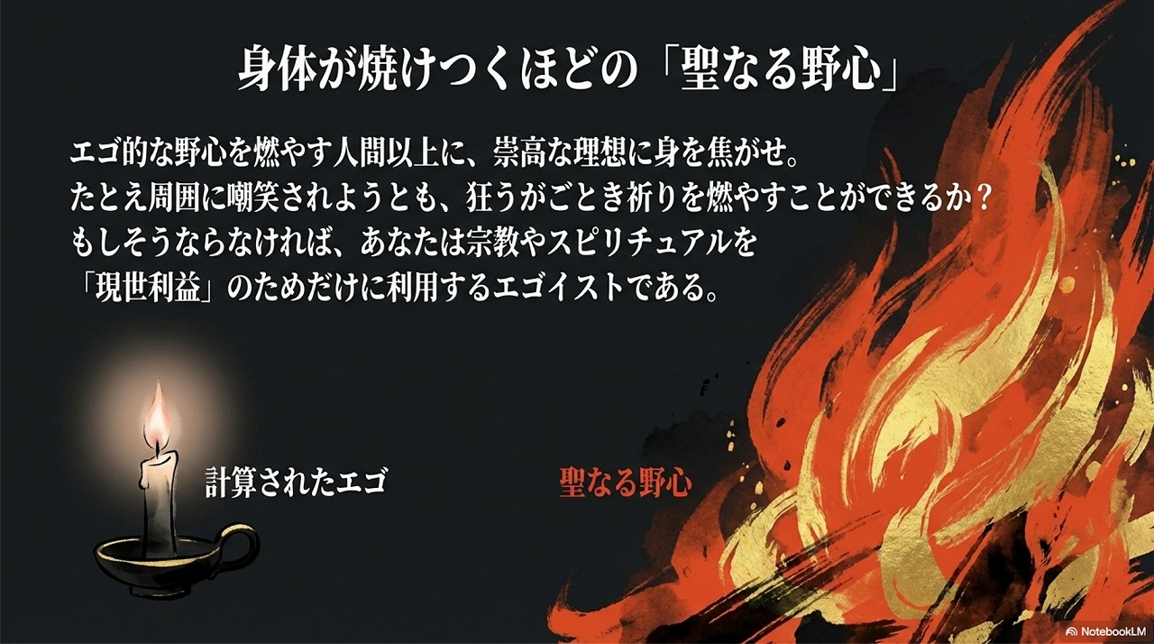 たいてい宗教やスピリチュアルに関心を持つ人は「いい人」が多いわけですが、そういう人こそエゴ的な野望をゴリゴリ持っている人以上に、【聖なる野心】を燦然と燃やさなければならない。
