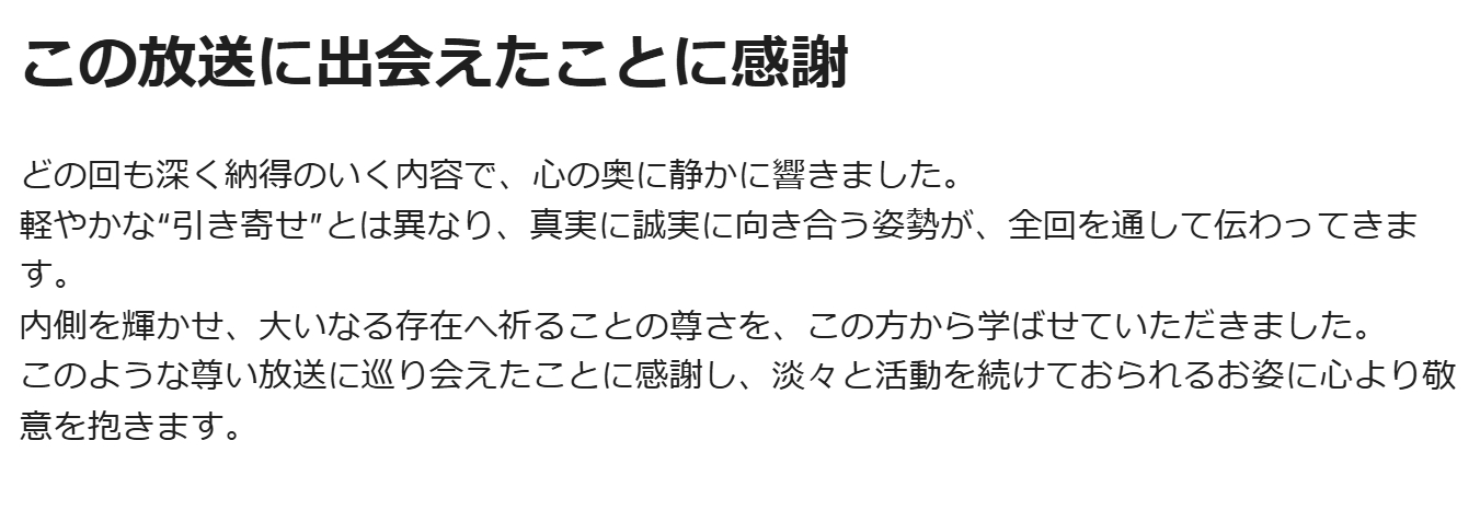どの回も深く納得のいく内容で心の奥に静かに響きました。軽やかな引き寄せとは異なり、真実に誠実に向き合う姿勢が全回を通して伝わってきます。内側を輝かせ、大いなる存在へ祈ることの尊さをこの方から学ばせていただきました。このような尊い放送に巡り会えたことに感謝し、淡々と活動を続けておられるお姿に心より敬意を抱きます。」