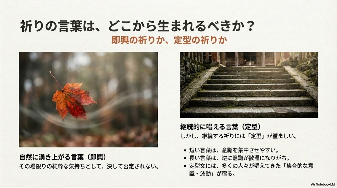 自然に湧き上がってくる「即興の祈り」は全然OKですが、無理やり頭でこねくり回して、変に独自のもの、オリジナルのものを作ろうとしなくてもいいです(自己顕示欲の強い人はやりがちですが)。