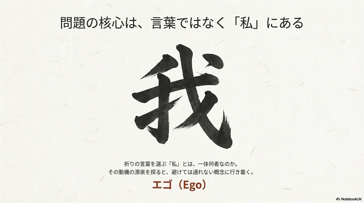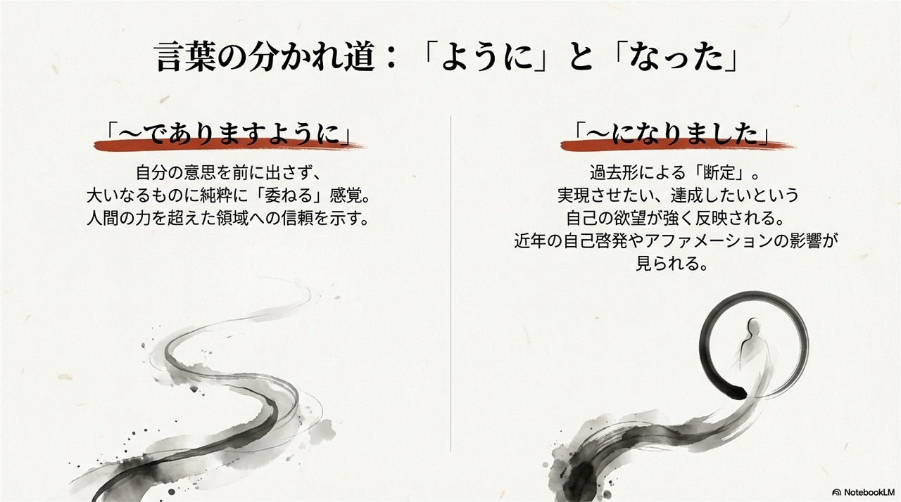 - 「なりました」という断定の祈りは主体が自分になりやすく、エゴが混入しやすいため、極めて高い霊的成熟が求められる。