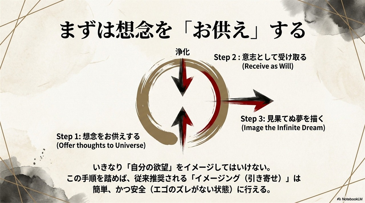- 自分の想念をまず神仏の祭壇にお供えして(ゆだねて)、神仏の側から浄められた想念を「頂き直す」ことにより、エゴを超えていけるようになる。